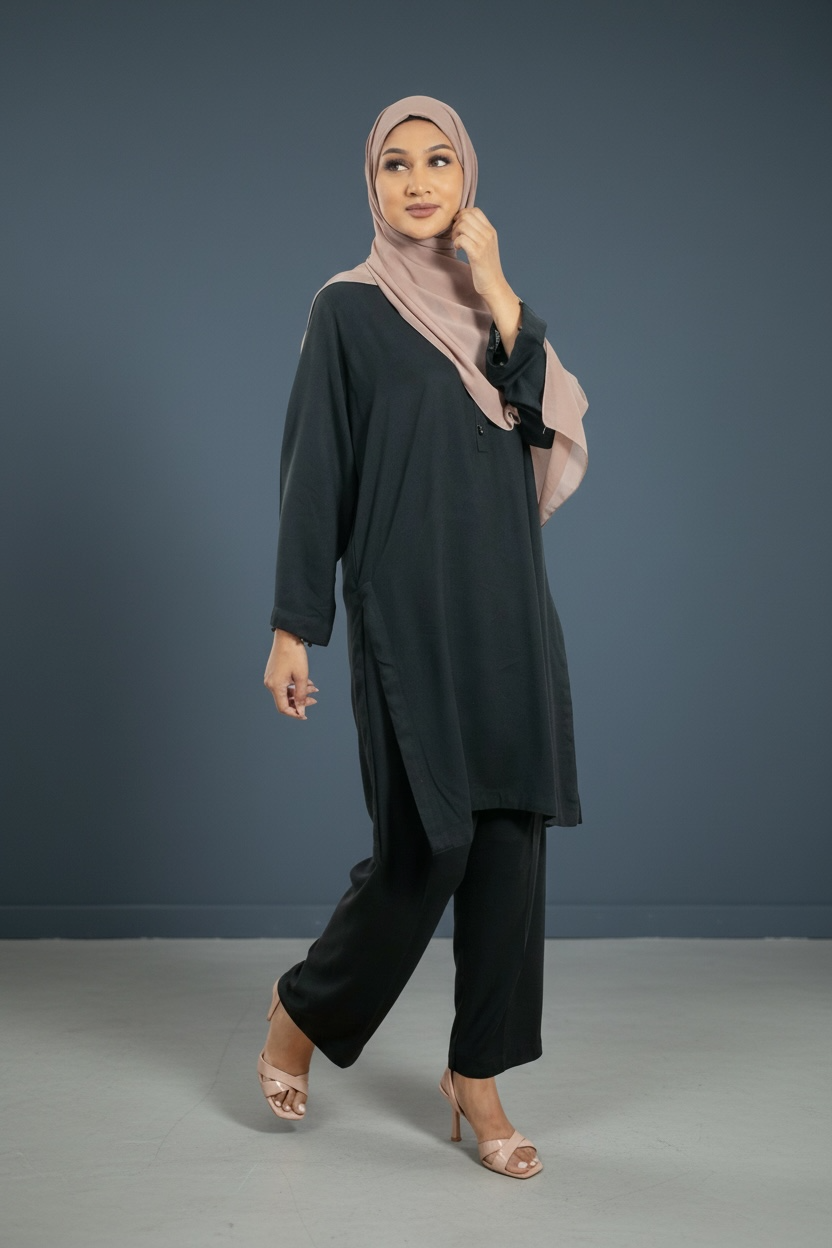 The longline top features a relaxed, modest cut with subtle side detailing, paired perfectly with straight-leg trousers for a refined yet comfortable finish. Ideal for both casual wear and dressed-up occasions, this versatile set transitions seamlessly from day to evening.