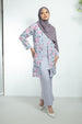 This elegant cotton lawn set features a stunning floral jacket, adorned with soft pink and white blooms against a light pastel background. The jacket is paired with a matching sleeveless slip and tailored trousers, both in a complementary solid shade. The lightweight and breathable fabric ensures comfort, making this ensemble perfect for warm weather while exuding effortless style and sophistication. Ideal for daytime outings or casual gatherings.