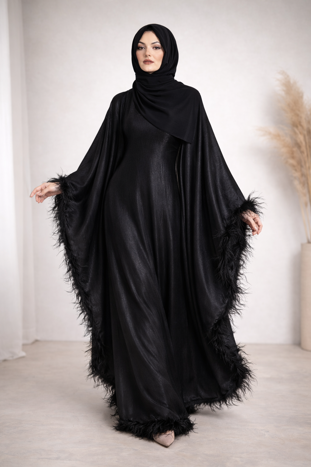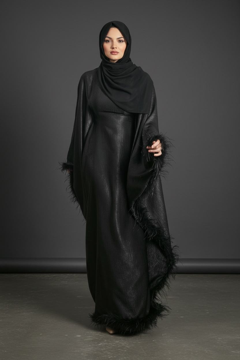 Adding a touch of glamour, the sleeves are finished with feather detailing all around, creating movement and elegance with every step. This unique detail makes the abaya perfect for special occasions and evening wear.