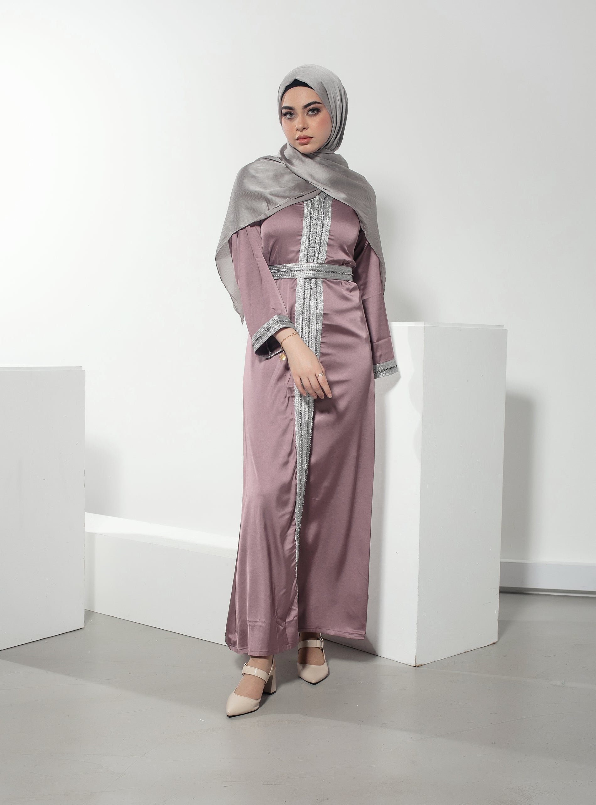 Elevate your wardrobe with our enchanting pink Moroccan-inspired abaya, adorned with delicate silver lace detailing and complemented by a matching lace belt. Embodying the spirit of Moroccan allure, this garment combines soft femininity with intricate craftsmanship, where every movement is a testament to timeless beauty and refined sophistication.
