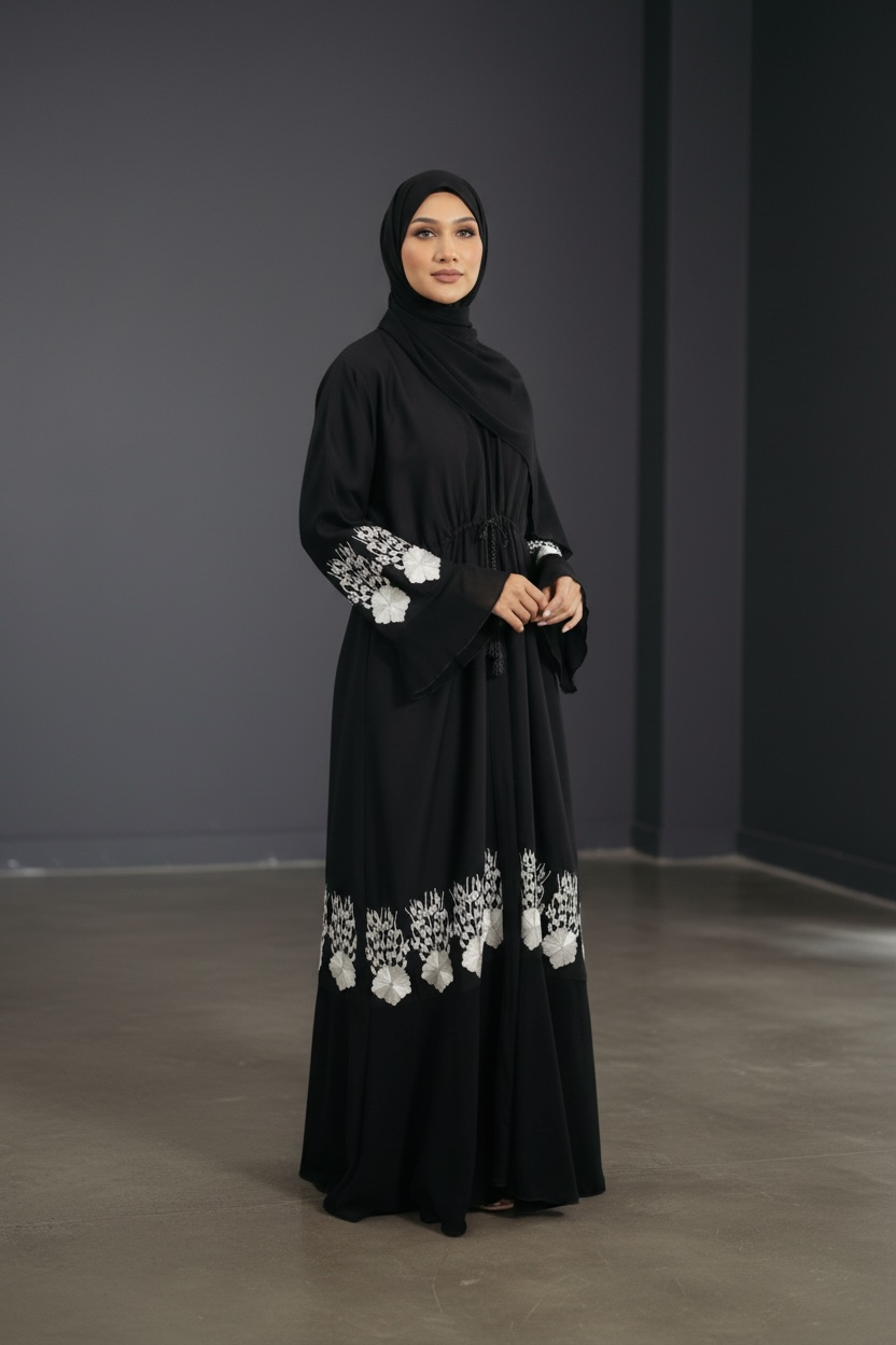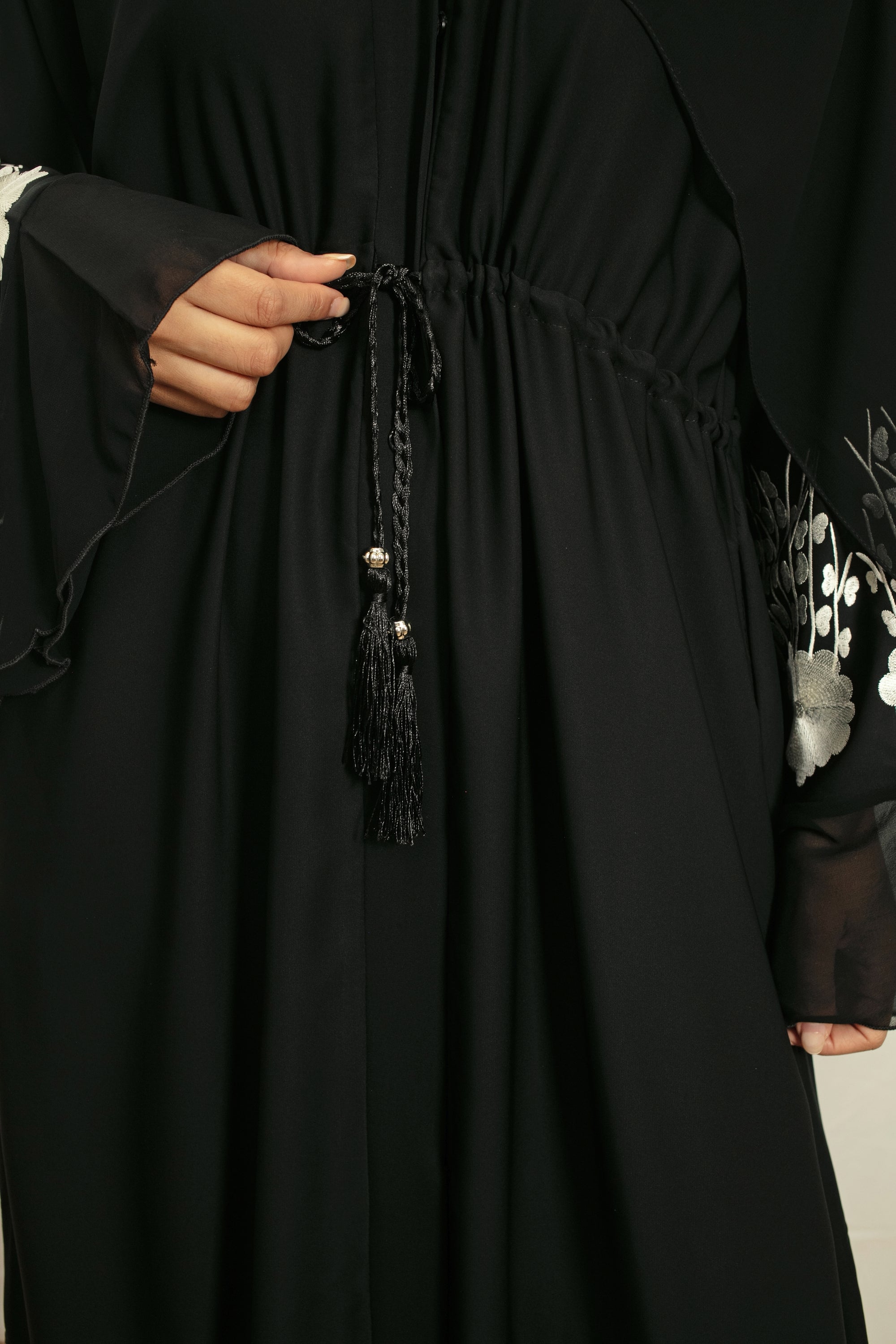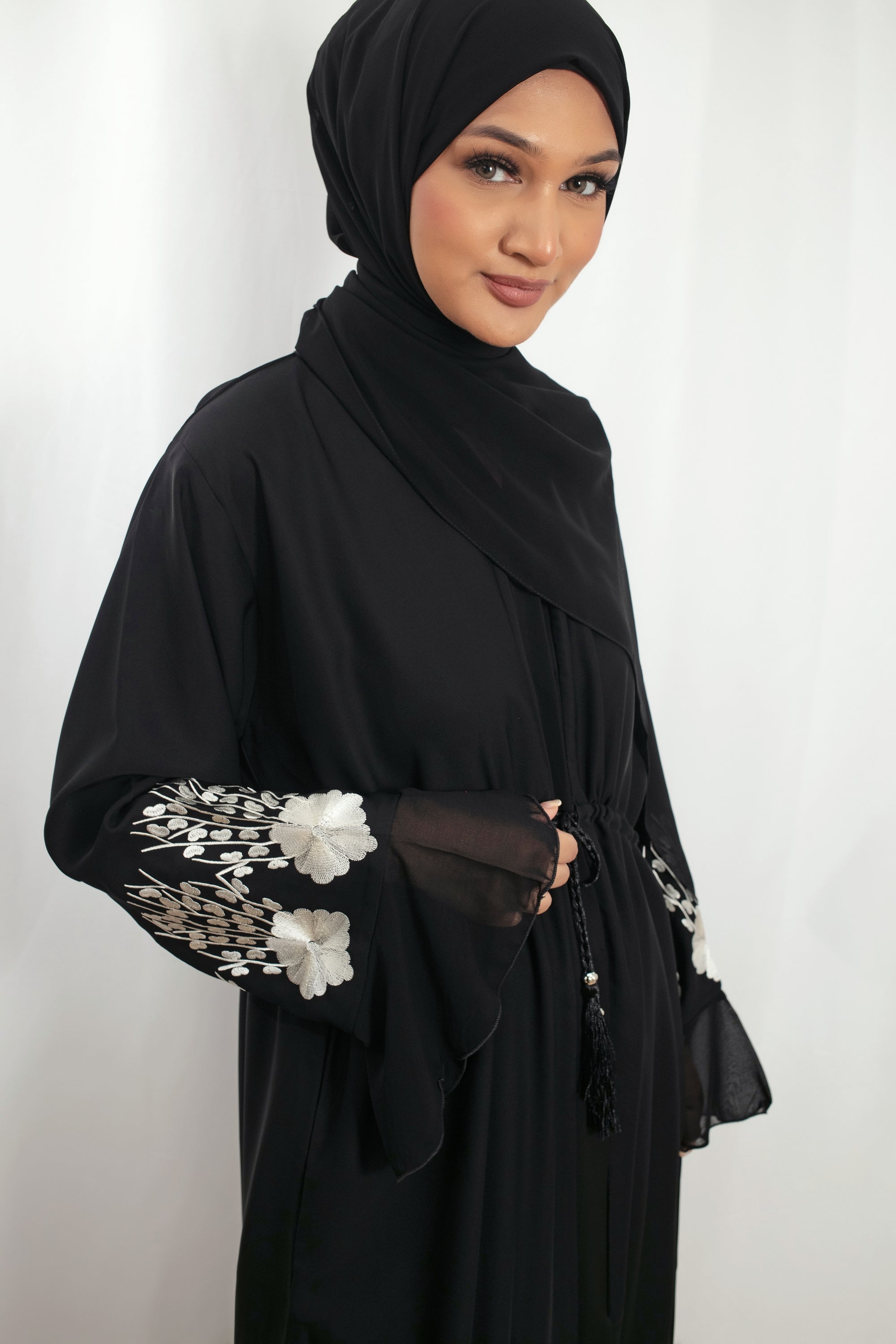 Delicate thread embroidery adorns the design, adding subtle texture and timeless charm without overpowering the silhouette. The abaya features double chiffon detailing on the sleeves and along the hem, creating beautiful flow and a lightweight finish with every step.