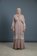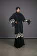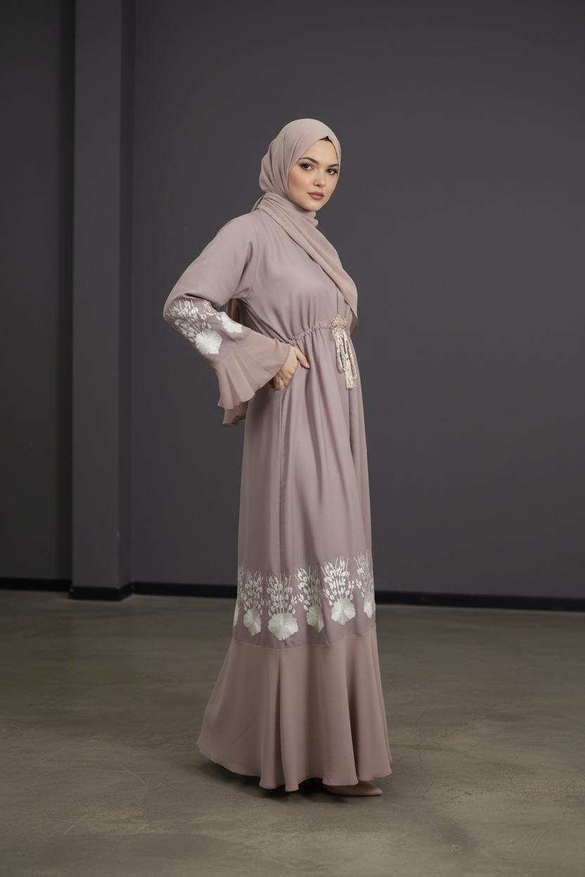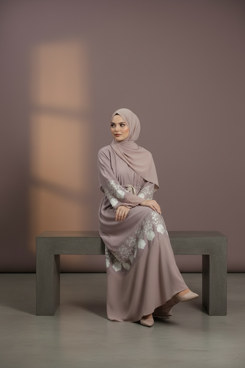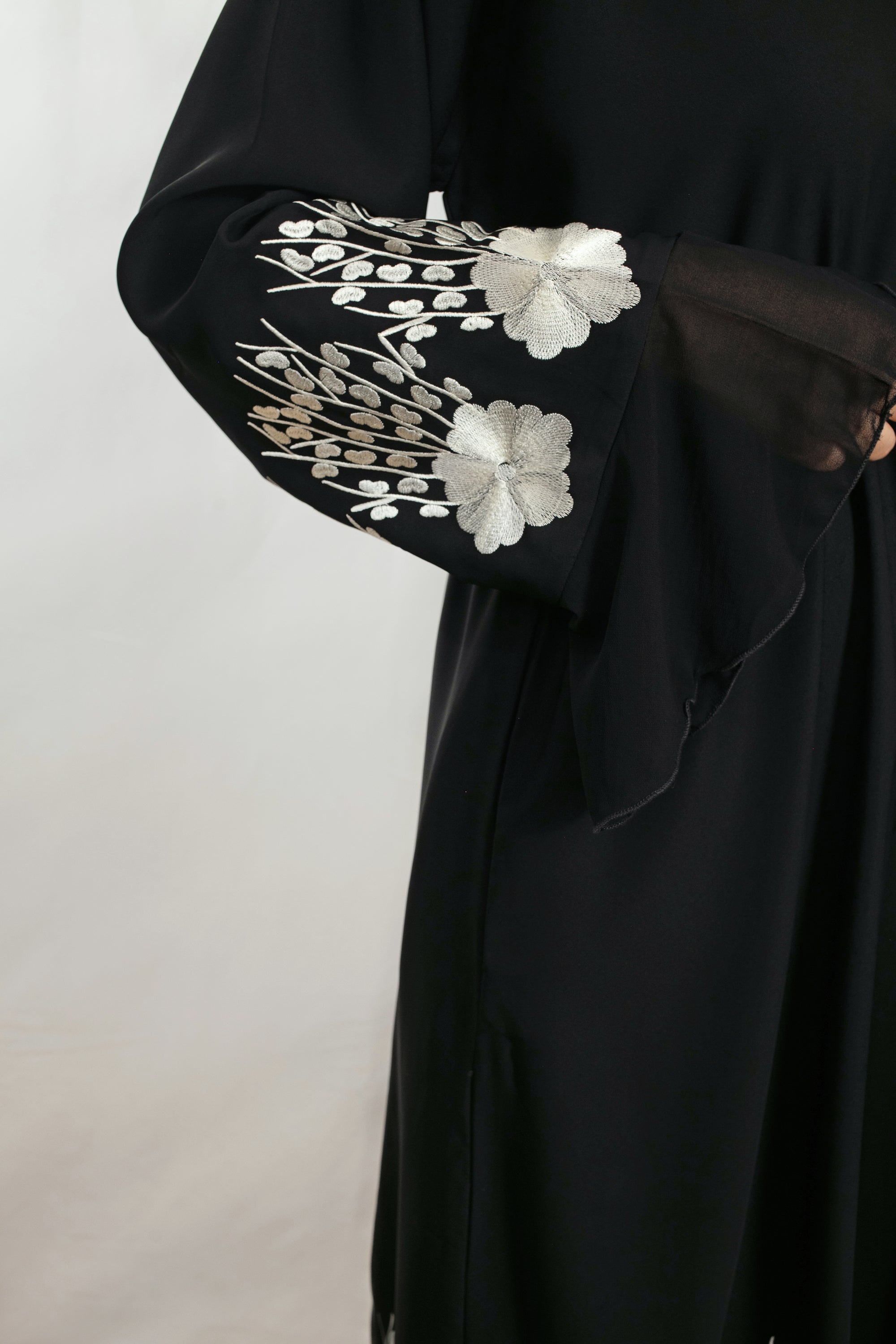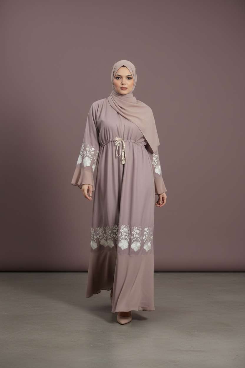 Delicate thread embroidery adorns the design, adding subtle texture and timeless charm without overpowering the silhouette. The abaya features double chiffon detailing on the sleeves and along the hem, creating beautiful flow and a lightweight finish with every step.