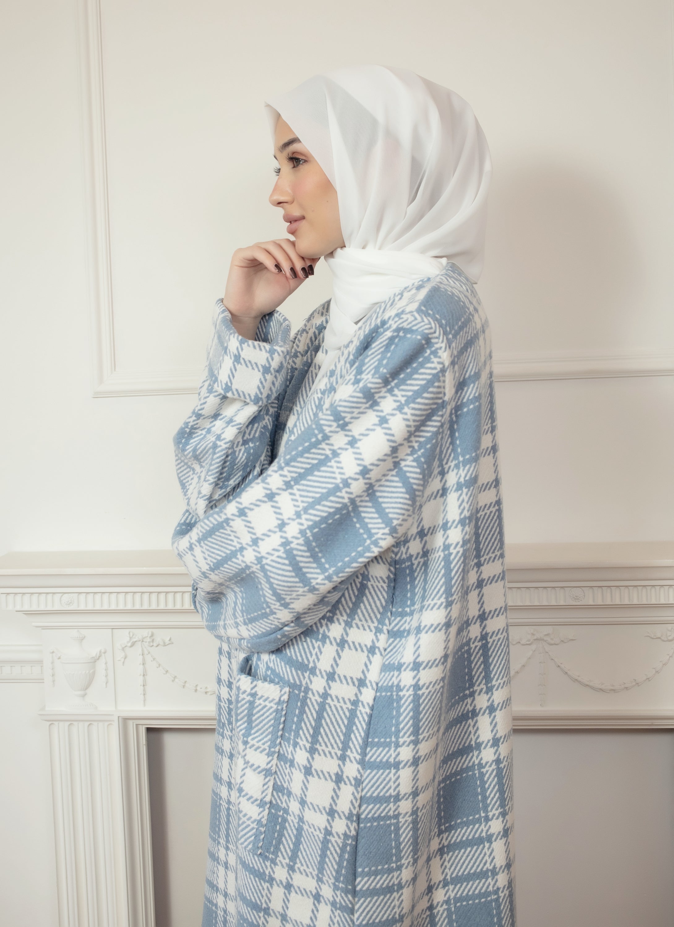 Introducing our collection of checked abaya coats, available in three timeless colours blue, black, and cream. Each coat is designed with a loose, comfortable fit for effortless layering and features convenient pockets for everyday practicality. The classic check pattern adds a stylish touch, making these abaya coats a versatile choice for both casual and more refined looks.